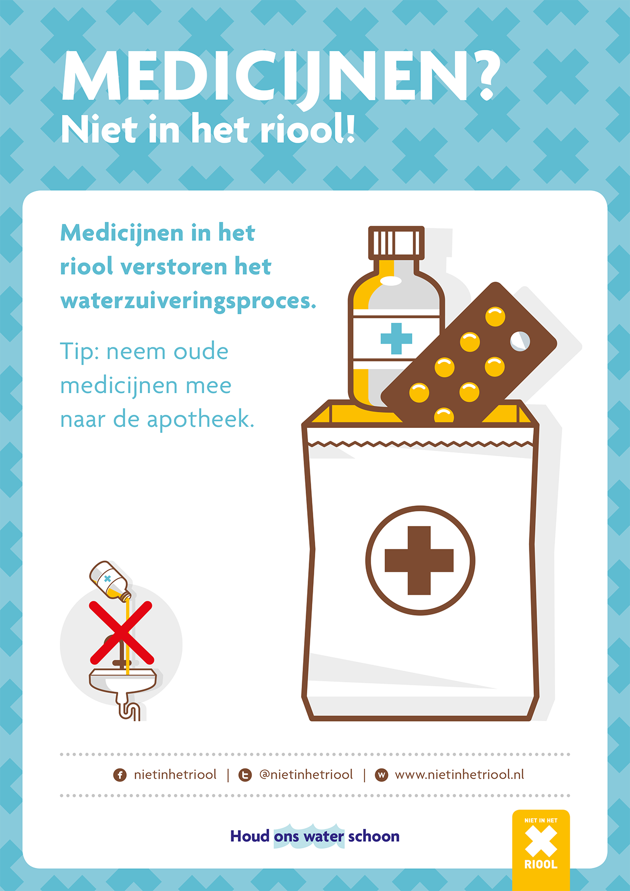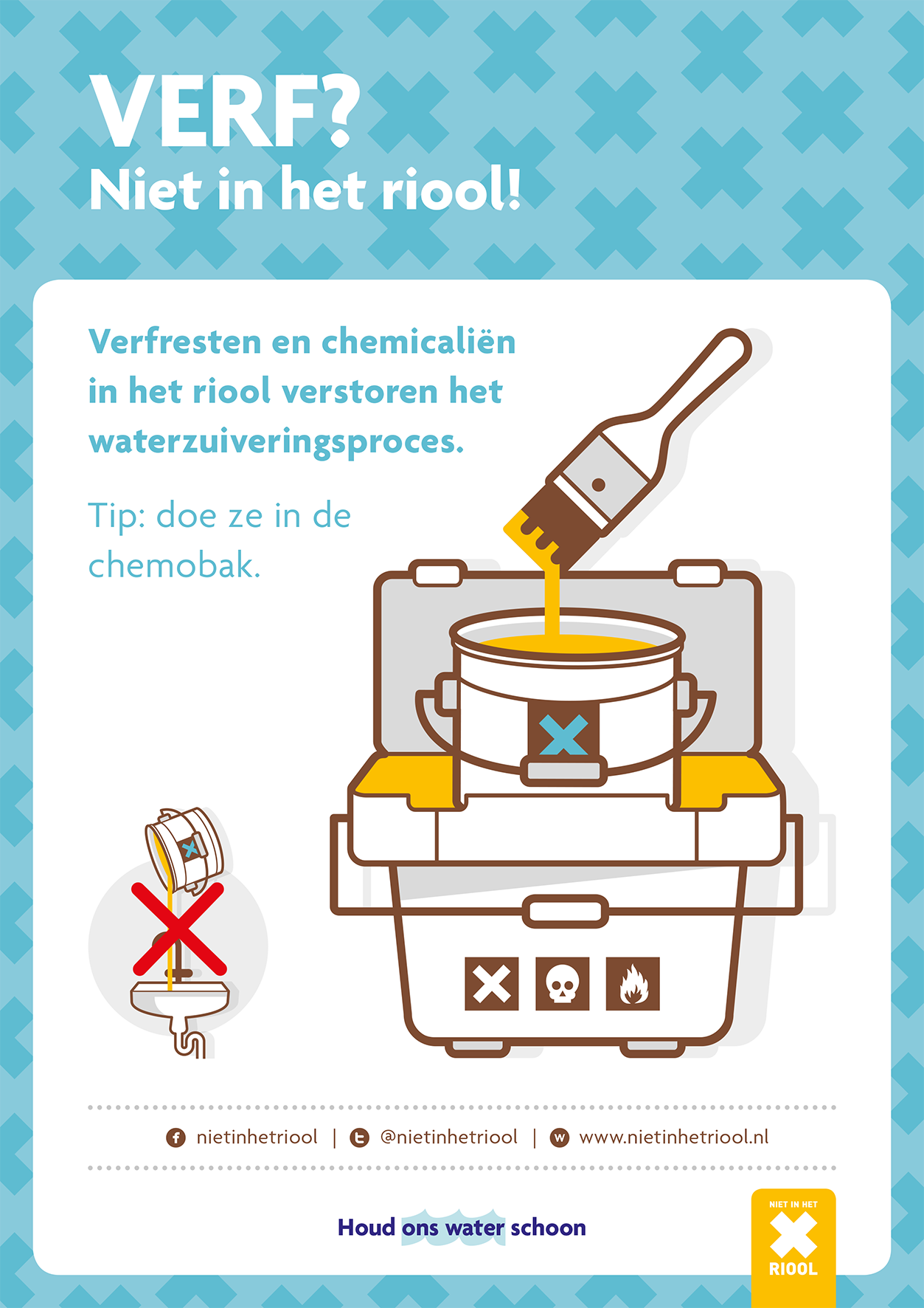 ‘Niet in het riool’ is de landelijke campagne voor goed rioolgebruik. Doekjes, vet, verf en medicijnen horen niet in het riool. Maak uw inwoners bekend met het belang van goed rioolgebruik. Hieronder vindt u diverse mogelijkheden om goed rioolgebruik in het Nederlands onder de aandacht te brengen.