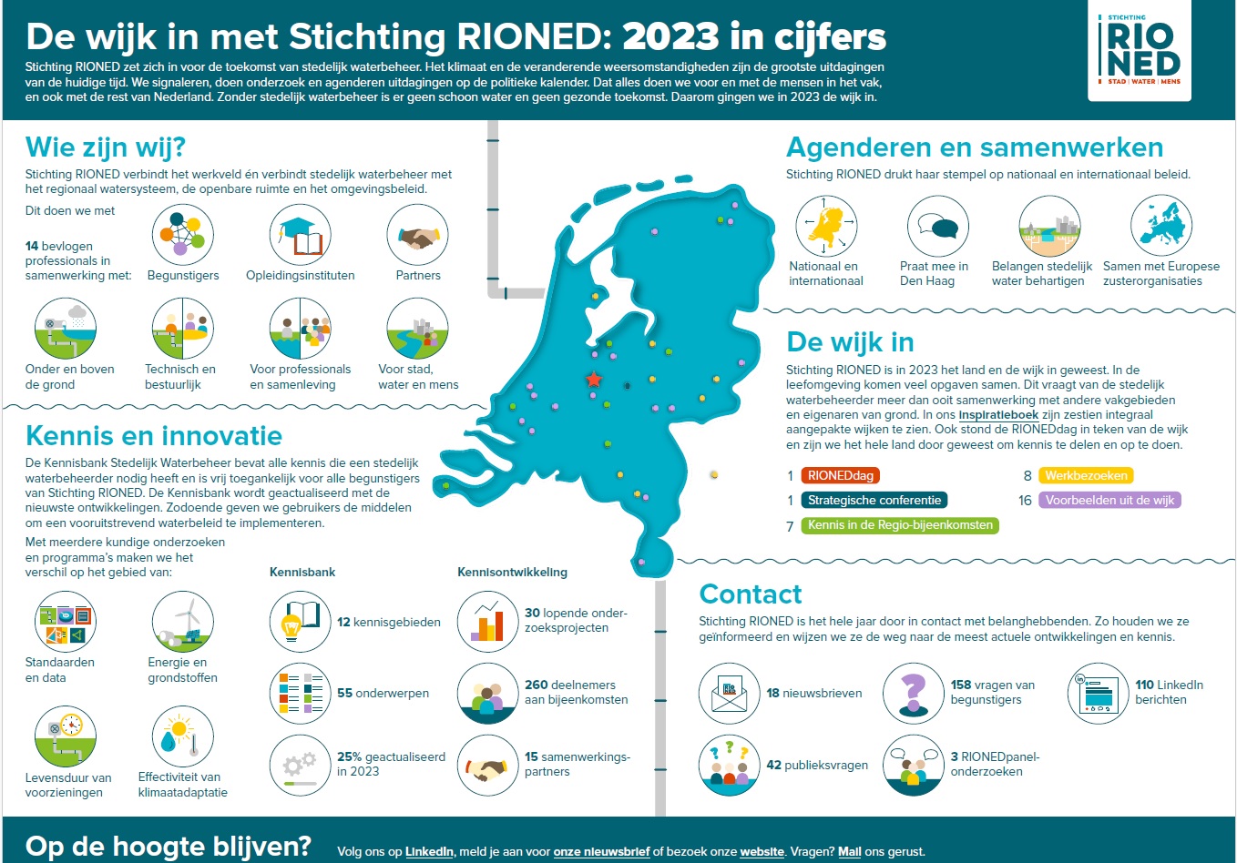 Het jaar 2023 gaat de boeken in als het natste ooit en tegelijkertijd als het warmste sinds 1901. Het klimaat en de veranderende weersomstandigheden zijn de grootste maatschappelijk opgaven van deze tijd. Op het gebied van stedelijk waterbeheer brengt dit nieuwe uitdagingen met zich mee. Onder andere overstromingen en droogte vragen om een integrale aanpak. Daarom ging Stichting RIONED in 2023 de wijk in. Want in de leefomgeving komen veel opgaven samen. Wat deden we allemaal nog meer? We hebben het voor u samengevat.